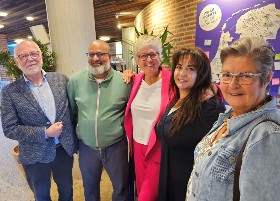 Foto: De ILOZ-delegatie bij kerkasiel Kampen, vóór de spelden-kaart van betrokken voorgangers en vrijwilligers. Vlnr. Flip Bakker, Shamier Madhar, Ria Pool (gastvoorganger), Vida Niazian, Annelies Stikkelorum. (foto ILOZ).