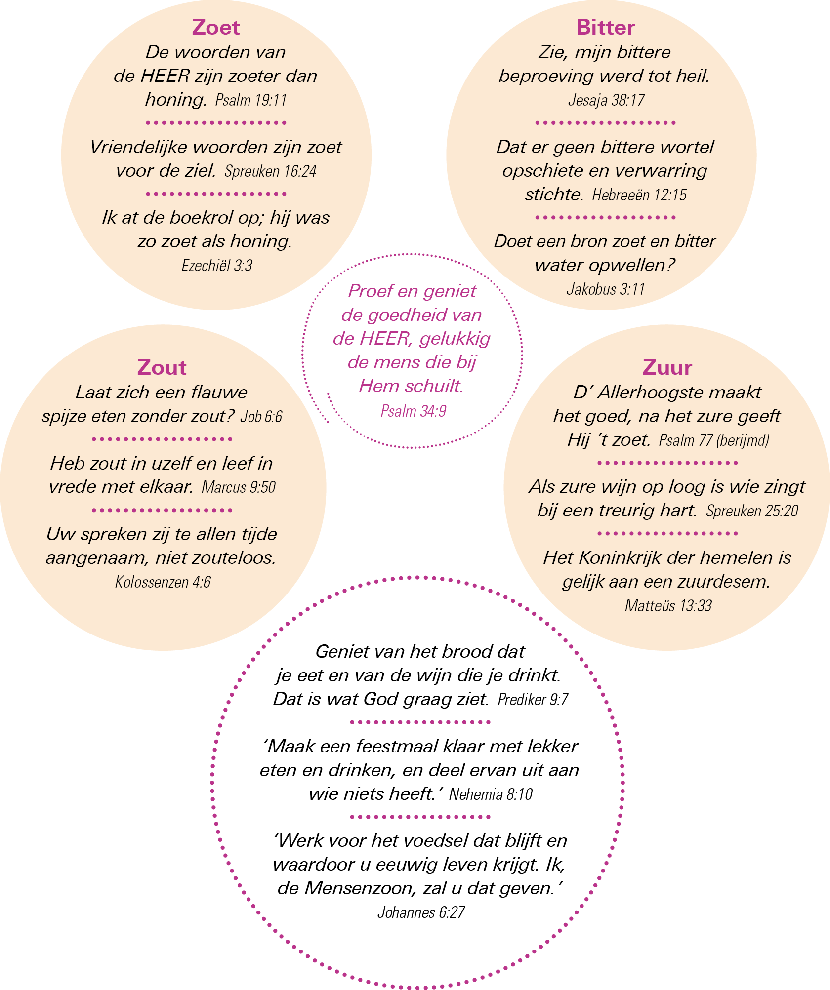 Als het leven zelf In het spoor daarvan kom je in de Bijbel vier smaken tegen: zoet, zout, bitter, zuur. Als letterlijke gewassen, vruchten en kruiderij die God laat groeien en ook als ingrediënten die symbool staan voor het leven zelf. Zoete dingen, die fijn en lekker zijn. Zure zaken, die vragen om doorbijten, maar ook verfrissen en energie geven. Zoute ervaringen van tranen en verdriet, die ook de nodige pit geven. Bittere momenten, die je liever niet zou meemaken, maar waarin God nabij kan zijn en je er doorheen kan trekken.